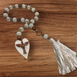 Este kit contém 1 base de MDF de 30cm de diâmetro, 1 aro de 28 cm de diâmetro, 45 metros de fio de juta de 3mm de espessura, 12 metros de fio de rami, 11 argolas plásticas de 7,5 de diâmetro e contas de madeira para os pés da bandeja.
